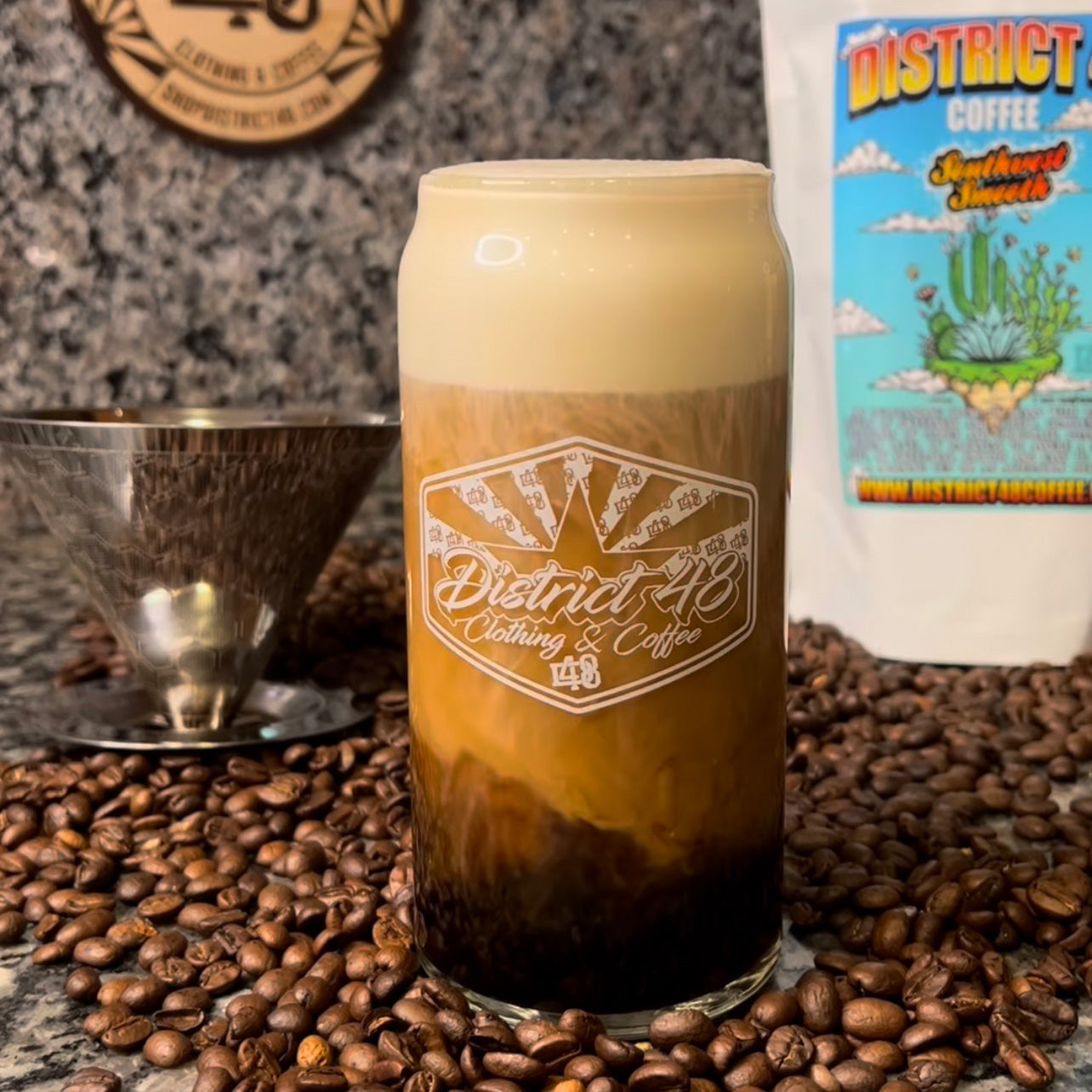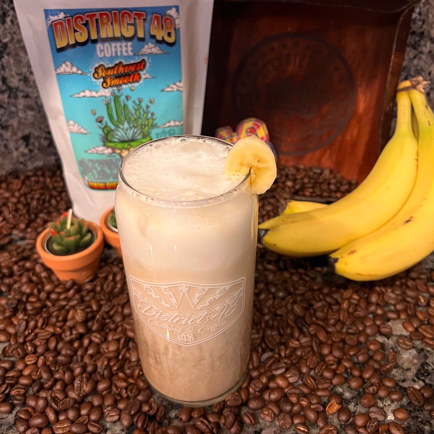 Add the banana blend to your glass with a few more ice cubes and pour in your chilled D48 Southwest Smooth Coffee. Leaving a little room for your frothed creamer on top. Enjoy!