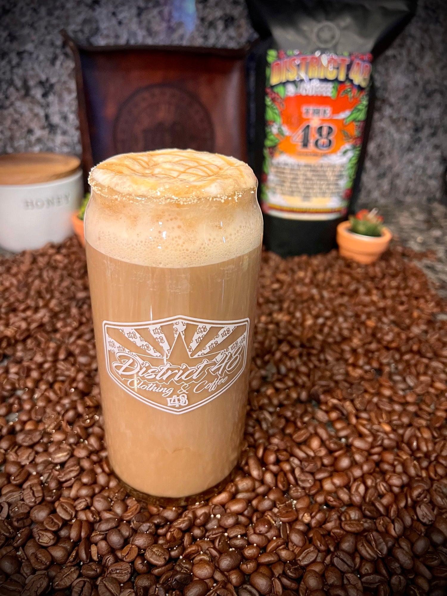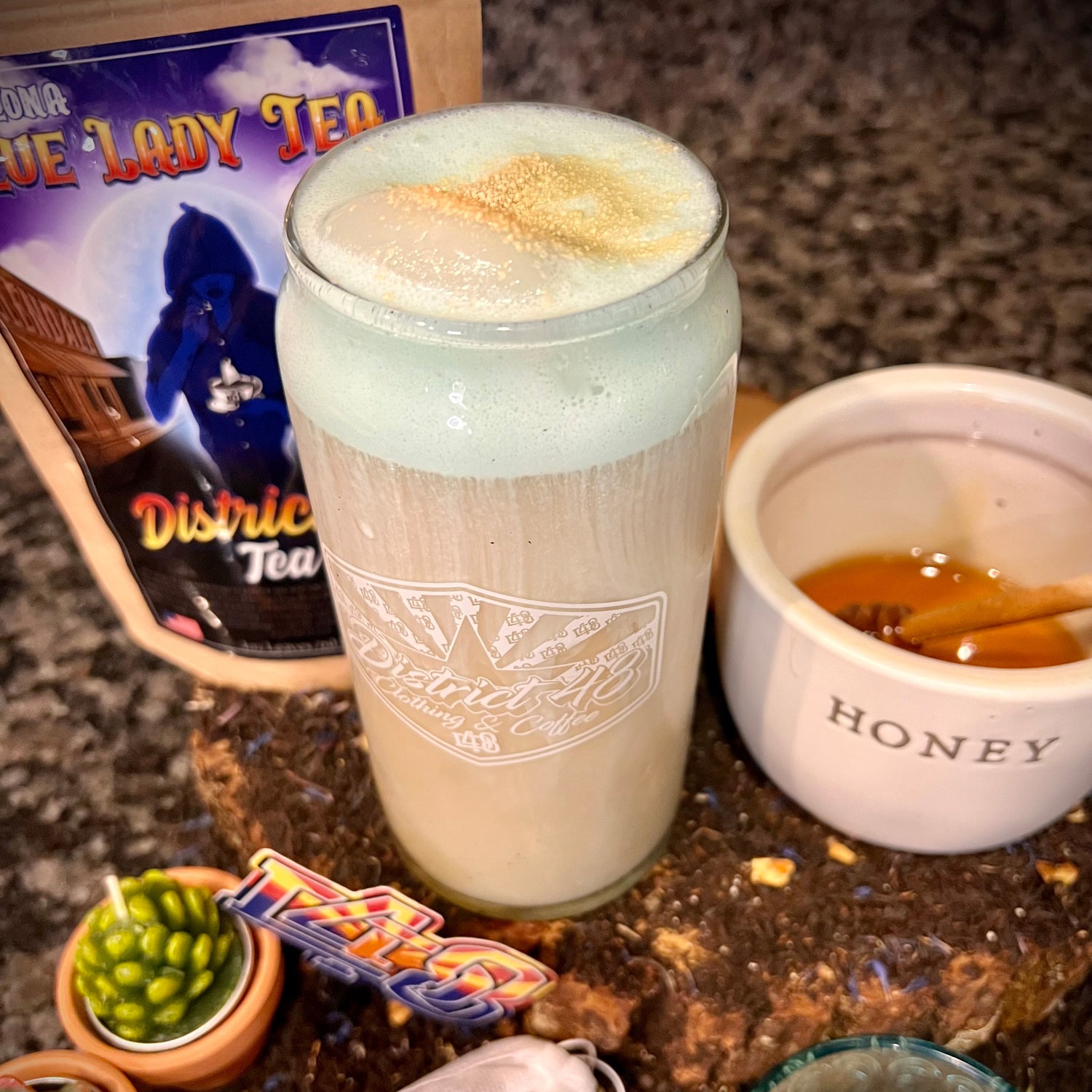In a Separate glass add a pinch of Freeze Dried Honey and a teaspoon (or more) of honey. Pour in your creamer and froth. Pour cold foam over Blue Lady Ice Tea and top with a Sprinkle of Freeze Dried Honey.