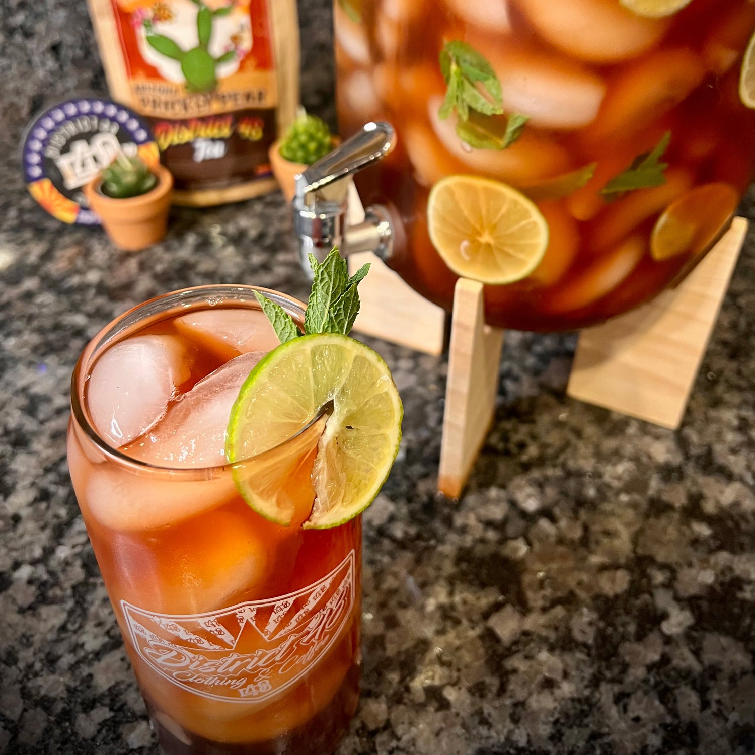 In a pitcher add 6 cups of chilled D48 Prickly Pear Tea, 4 pumps of Mojito Libre @amoretti beverage infusion, and 1 cup of sugar.